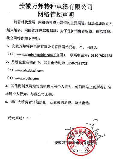 鄭重聲明:安徽萬邦特種電纜有限公司官方網站為:www_wanbangcable_com.hsxqy.com,除此之外無任何子網站或合作網站,其余均為假冒偽劣。電話:0550-7621728 13485756353 地 址:安徽省天長市滁州高新技術產業開發區經四路29號